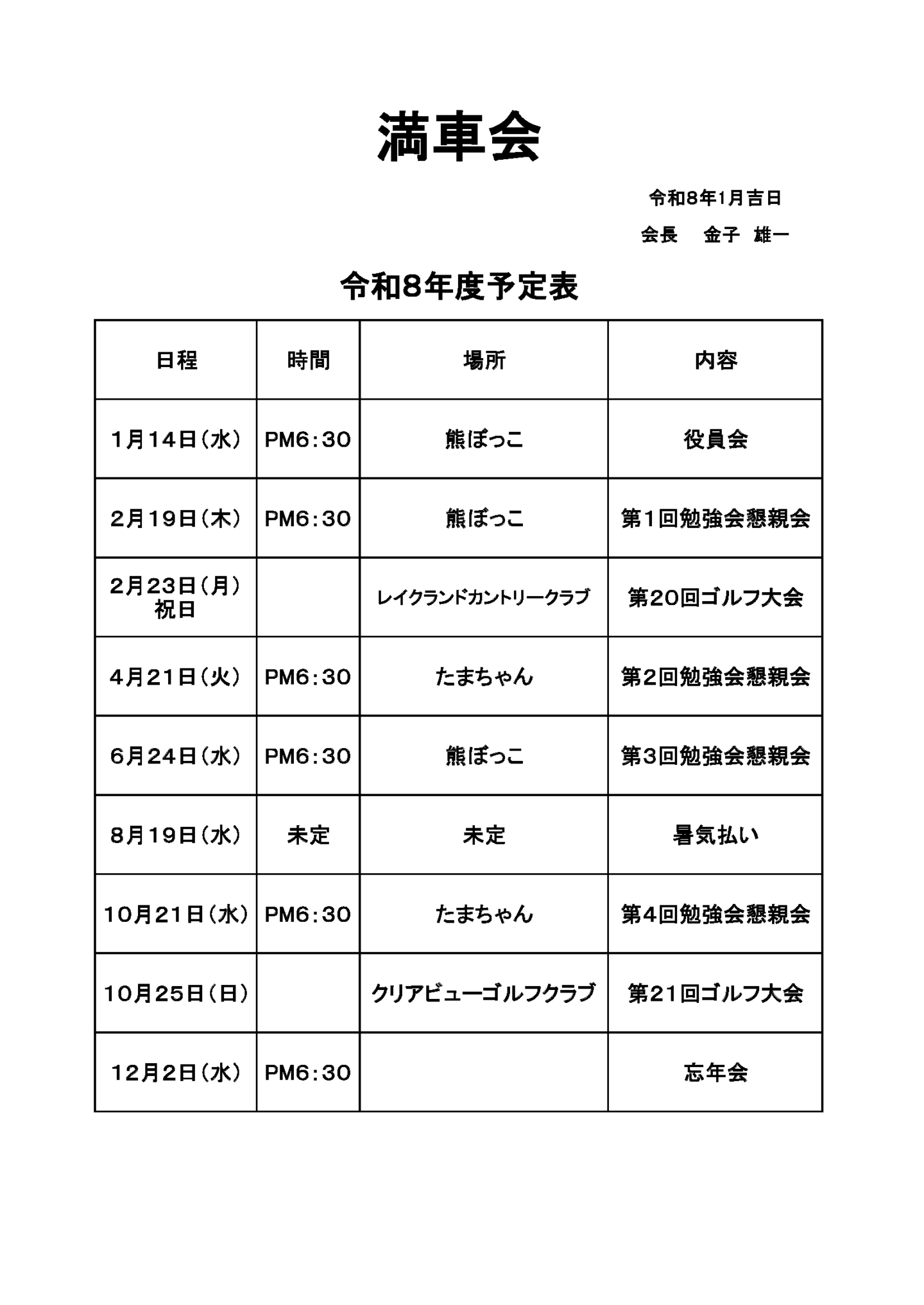 2026年満車会活動予定